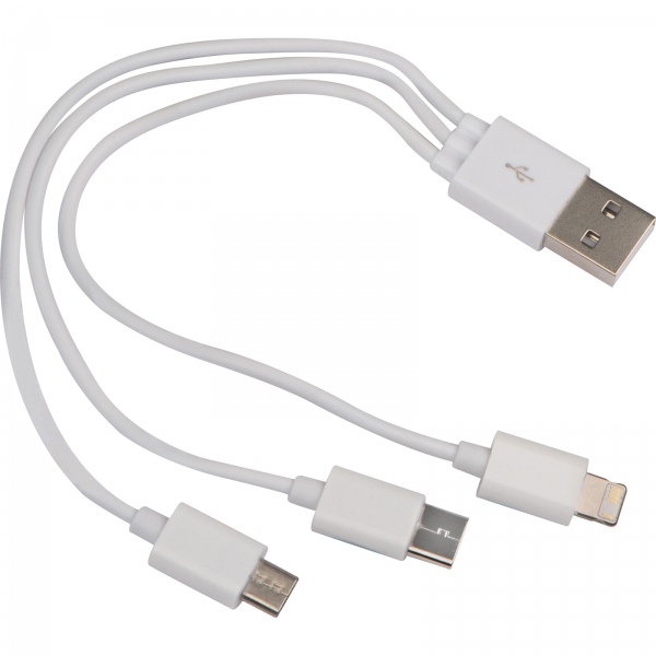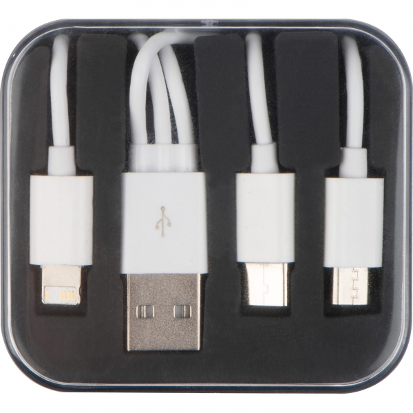 Zestaw przejściówek do ładowania urządzeń z systemem Android i iOS, portami micro USB oraz USB. Całość zapakowana w plastikowe pudełko z przezroczystym wieczkiem.