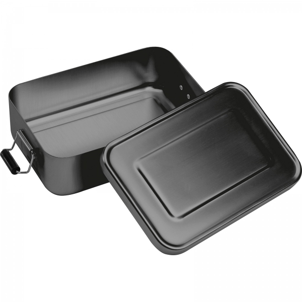 Trwałe i przyjazne środowisku pudełko na przekąski lub lunch, o pojemności 1000 ml. Wykonane z aluminium, wyposażone w dwa mocne zatrzaski zapewniające bezpieczne przenoszenie jedzenia.