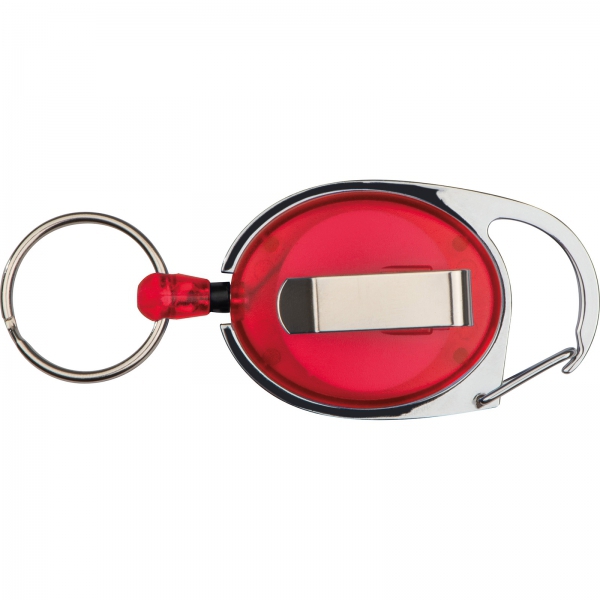 Plastikowy brelok z metalowym karabińczykiem, klipsem do paska oraz kółkiem na zwijanej lince.