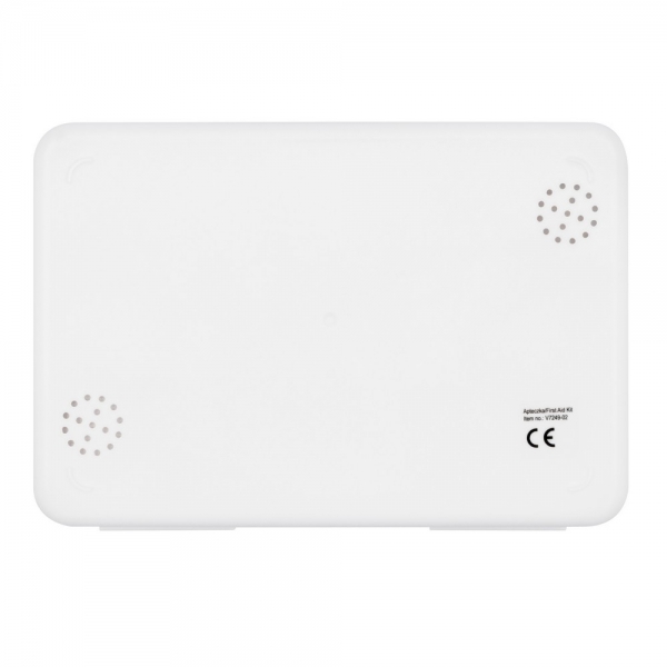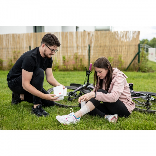 Apteczka w plastikowym opakowaniu, wewnątrz: plastry 72x19 mm (10 szt.), plastry 56x19 mm (5 szt.), plastry 40x10 mm (5 szt.), plastry Ø22 mm (5 szt.), plastry elastyczne 76x38 mm (2 szt.), płatki nasączone alkoholem 3x6 cm (6 szt.), opatrunki nieprzylegające 5x7,5 cm (2 szt.), taśma non-woven 1,25 cm x 4,5 m (1 szt.), bandaż elastyczny 7,5 cm x 4 m (1 szt.), nożyczki (1 szt.), chusteczki antyseptyczne 2x20 cm (4 szt.), patyczki kosmetyczne (10 szt./torebka), agrafki (10 szt.), rękawiczki jednorazowe (1 para), okład na ranę non-woven 5x9 cm (1 szt.)