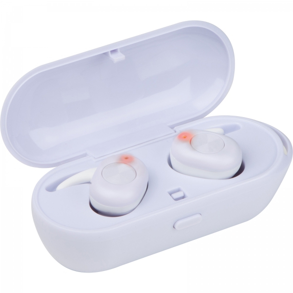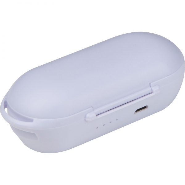 Plastikowe (ABS) słuchawki douszne Bluetooth. W zestawie z kabelkiem do ładowania i stacją ładującą, która służy również jako opakowanie. Czas grania 2-3 godziny, czas ładowania ok. 1 godzina, bateria 35 mAh.