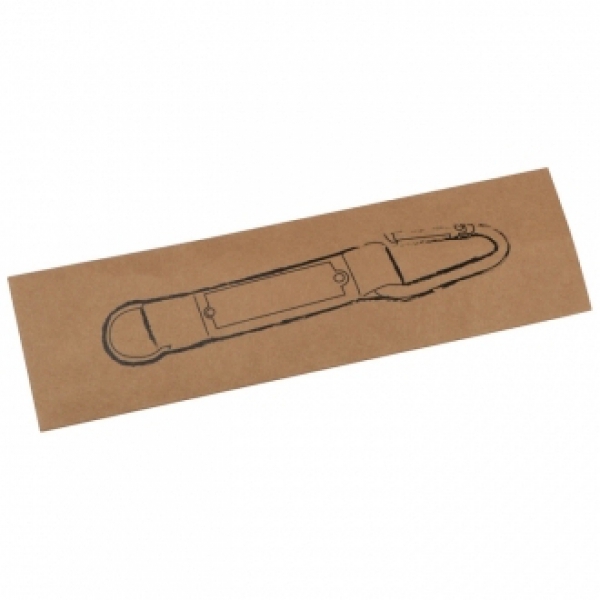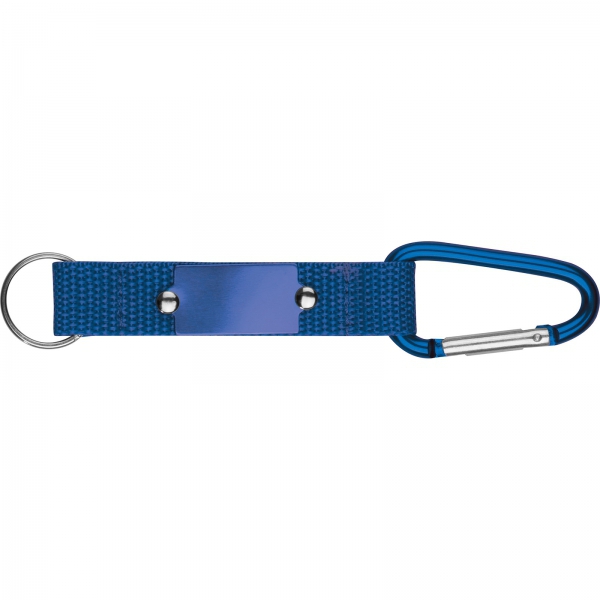 Metalowy brelok do kluczy z karabińczykiem na poliestrowej taśmie.
