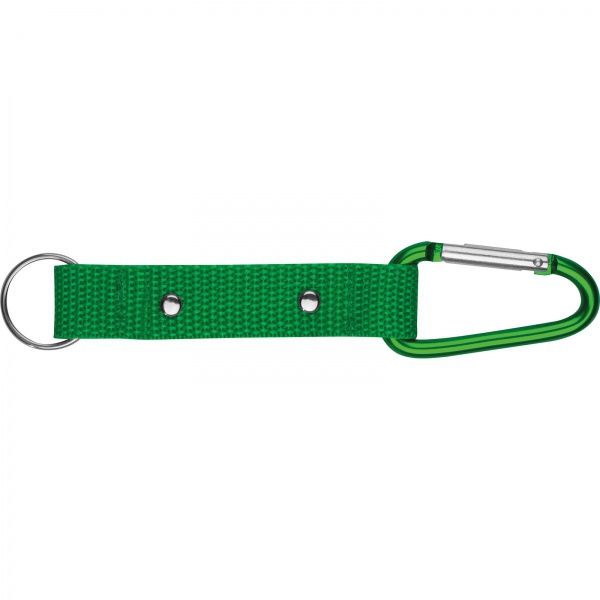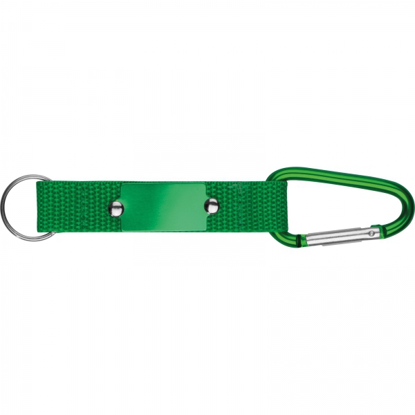 Metalowy brelok do kluczy z karabińczykiem na poliestrowej taśmie.