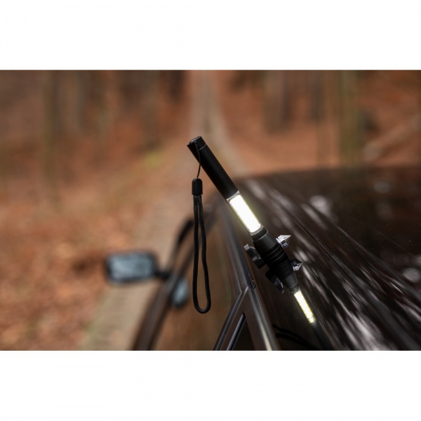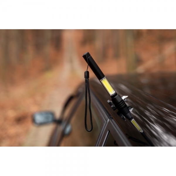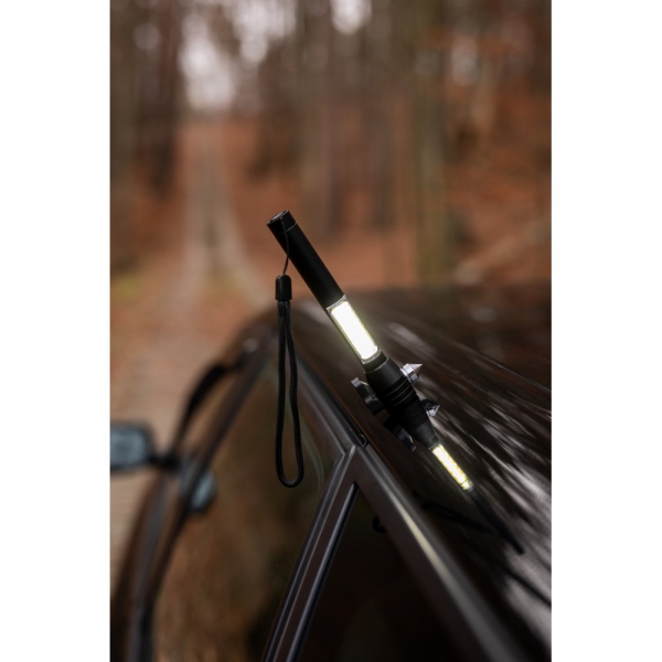Latarka bezpieczeństwa ze światłem 1 LED COB o mocy 100 lumenów, posiada magnes umożliwiający przyczepienie, przecinak do pasów bezpieczeństwa oraz młotek bezpieczeństwa, w komplecie uchwyt ułatwiający noszenie, produkt wykonany z metalu