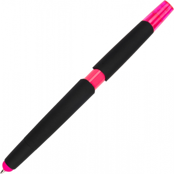 Plastikowy długopis z zakreślaczem. Posiada gumowaną powierzchnię, wkład piszący na niebiesko i końcówkę do obsługi ekranów dotykowych.