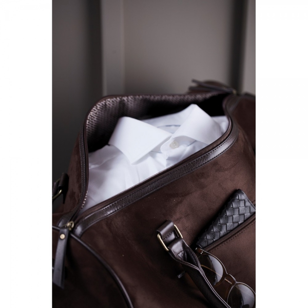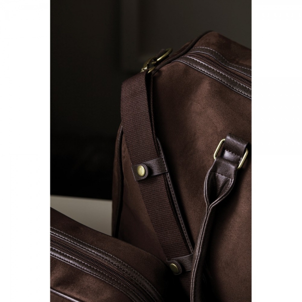 Plecak, torba podróżna, sportowa, wykonana z imitacji zamszu, detale ze skóry z PU oraz mosiądzu