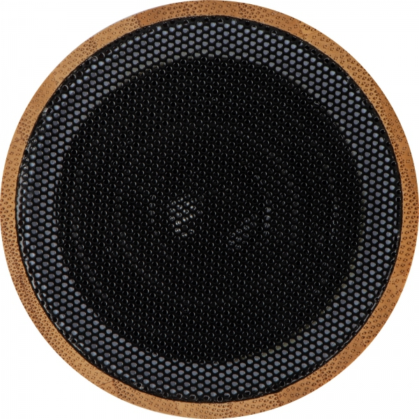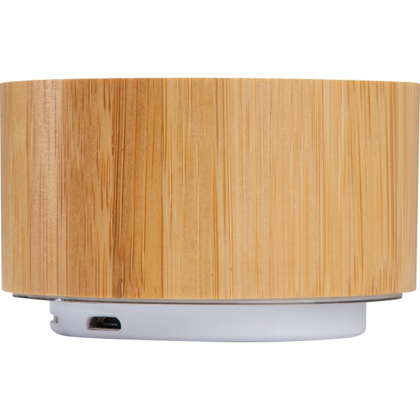 Głośnik Bluetooth z powłoką bambusową, podświetleniem od spodu, gniazdem na kartę i kablem do ładowania.
