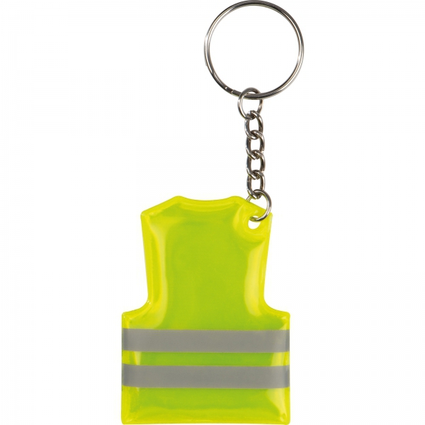 Plastikowy brelok odblaskowy w kształcie kamizelki bezpieczeństwa.