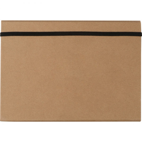 Podwójnie składany, zamykany na gumkę tekturowy folder zawiera: 80-stronicowy notes w linie, 20 kolorowych samoprzylepnych karteczek w 5 kolorach, żółte karteczki, dwie linijki (w tym jedna drewniana), długopis, drewnianą temperówkę, gumkę do ścierania i dwa ołówki.