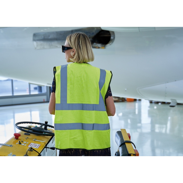 Kamizelka odblaskowa dla dorosłych z odblaskowymi paskami (klasa 2). Wykonana z poliestru. Posiada certyfikat ISO 20471.
