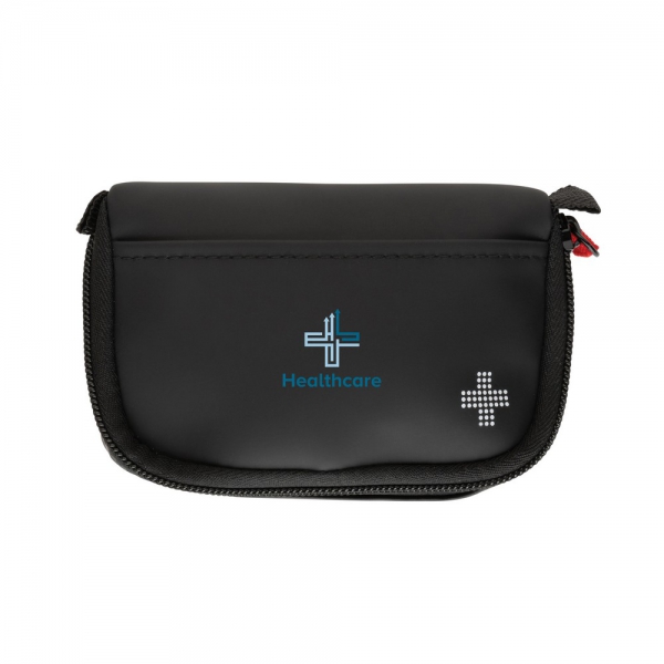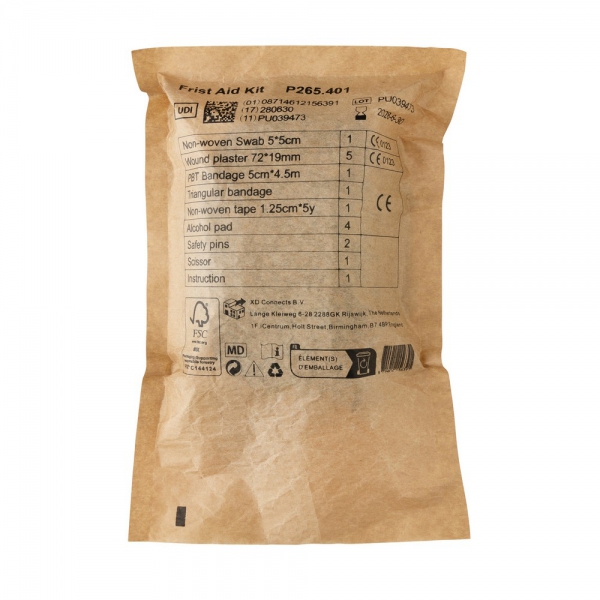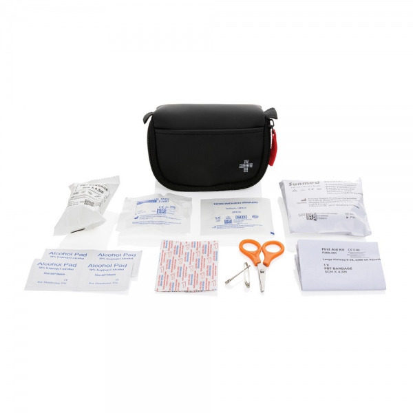 Apteczka 16 el., w pokrowcu z materiałów z recyklingu na zamek błyskawiczny, wewnątrz: bandaż trójkątny, bandaż PBT, waciki nasączone alkoholem 4 szt., wacik, plastry 5 szt., nożyczki, szpilki 2 szt., taśma, zapakowana apteczka mieści się w skrzynce pocztowej, spełnia wymagania normy EN ISO 13485:2016, 93/42/EWG i UE (2017/745), całkowita zawartość materiałów z recyklingu obliczona na podstawie wagi całkowitej produktu: 59%