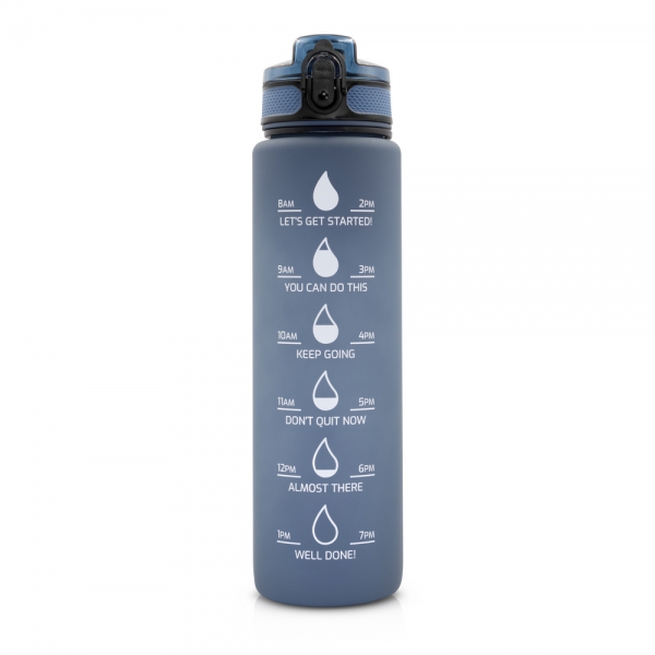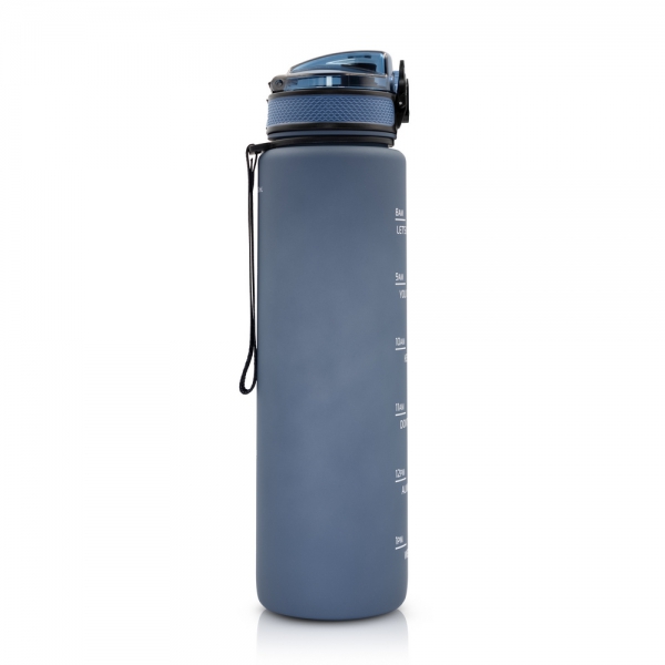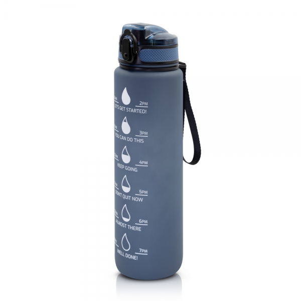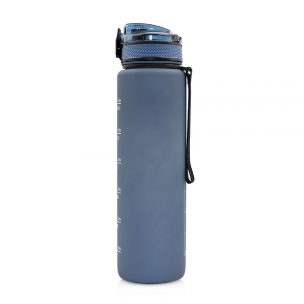 Butelka motywacyjna 1000 ml, skala ml z jednej strony i podziałka motywacyjna z drugiej strony, zamknięcie z blokadą, pasek na rękę (pakowany oddzielnie), gumowane wykończenie, przeznaczona wyłącznie do zimnych i niegazowanych napojów