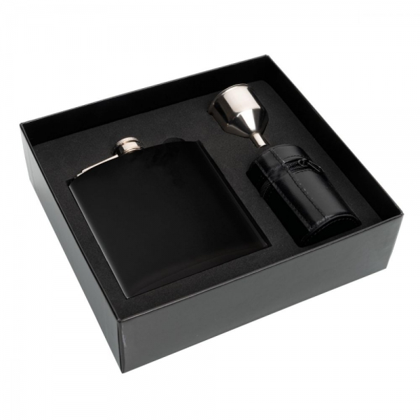 Piersiówka o pojemności 237 ml marki Schwarzwolf. Piersiówka o prostym kształcie, z czterema kieliszkami w zestawie.