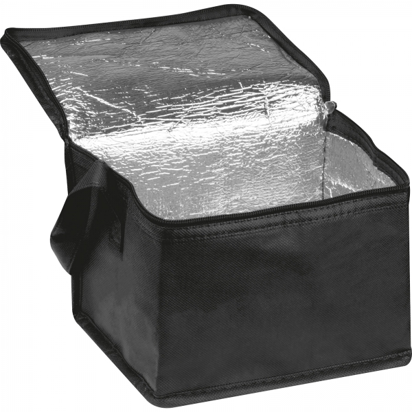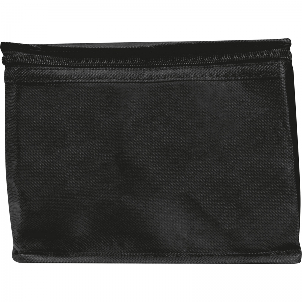Torba chłodząca wykonana z materiału non-woven, zamykana na zamek, z paskiem. Pomieści 6 puszek (o pojemności 0,33 l).