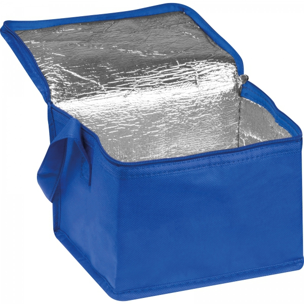 Torba chłodząca wykonana z materiału non-woven, zamykana na zamek, z paskiem. Pomieści 6 puszek (o pojemności 0,33 l).