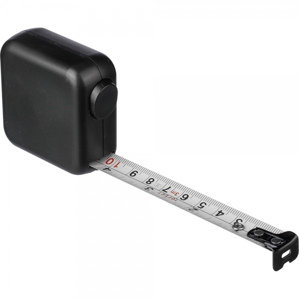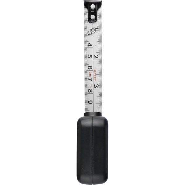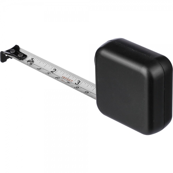 Miara o długości 3 metrów w centymetrach i calach, blokada przyciskowa poprawiająca komfort użytkowania oraz umożliwiająca samodzielne mierzenie, zapakowana w brązowy kartonik, produkt wykonany z ABS