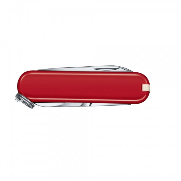 Narzędzie wielofunkcyjne Victorinox Classic SD z 7 funkcjami: wykałaczką, nożyczkami, pęsetą, pilnikiem do paznokci, śrubokrętem (2,5 mm), brelokiem do kluczy i małym ostrzem, zapakowane w pudełko upominkowe, produkt wykonany z ABS i metalu
