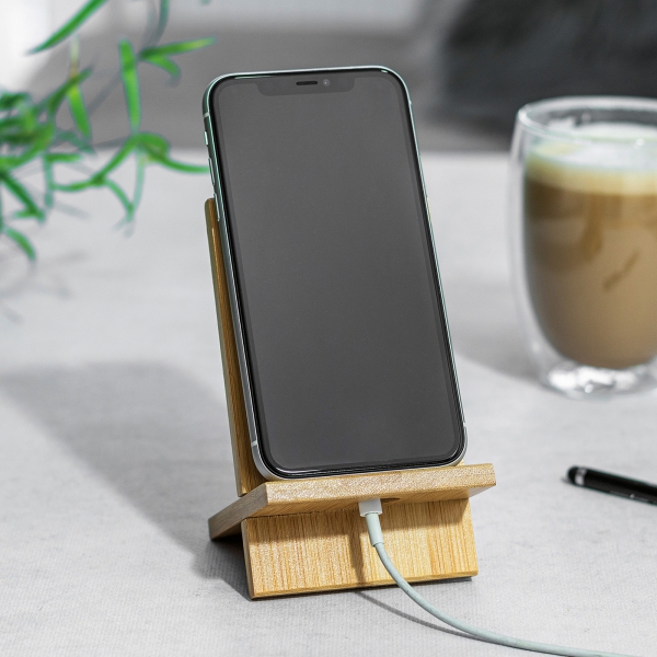 Bambusowa podstawka pod telefon z dziurką na kabel, umożliwiającą podłączenie ładowarki.