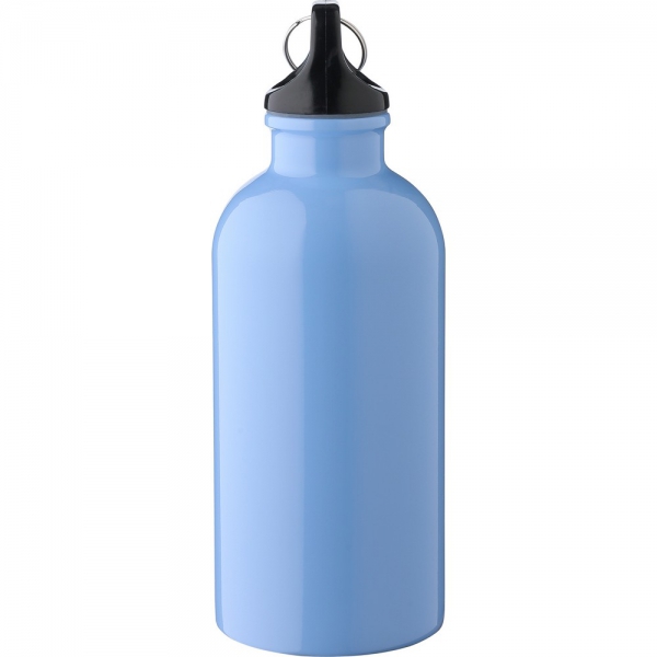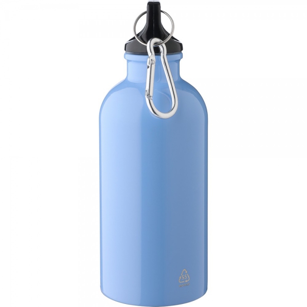 Butelka sportowa 400 ml, ikona recyklingu na produkcie, nie nadaje się do mycia w zmywarce, produkt wykonany ze stali nierdzewnej z recyklingu, nakrętka z PP, srebrny aluminiowy karabińczyk