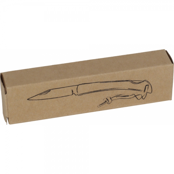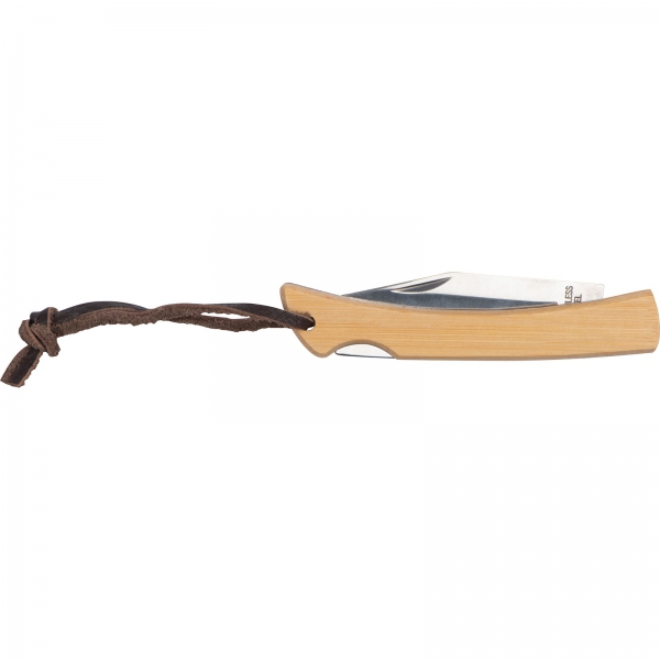 Mały nóż - finka, z ostrzem wykonanym ze stali nierdzewnej, drewnianą rączką i pętelką z rzemyka.