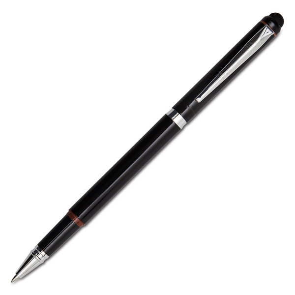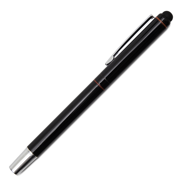 Zestaw składający się z aluminiowego długopisu i pióra kulkowego wyposażonych w końcówkę do obsługi ekranów dotykowych, pakowanych w etui z ekoskóry. Chromowane dodatki. Wkład do długopisu o średnicy 1,00 mm w kolorze niebieskim, nabój o średnicy 0,7 mm do pióra kulkowego także w kolorze niebieskim. Pakowany w czarne opakowanie upominkowe.