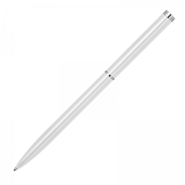Metalowy długopis z chromowanym klipsem i wkładem piszącym na niebiesko.