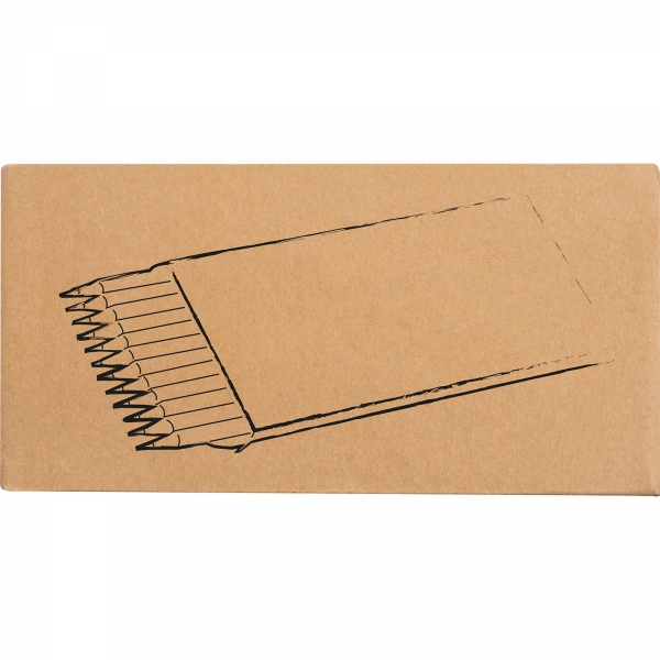 Zestaw drewnianych kredek w 12 różnych kolorach. Kredki pakowane w tekturowe pudełko.