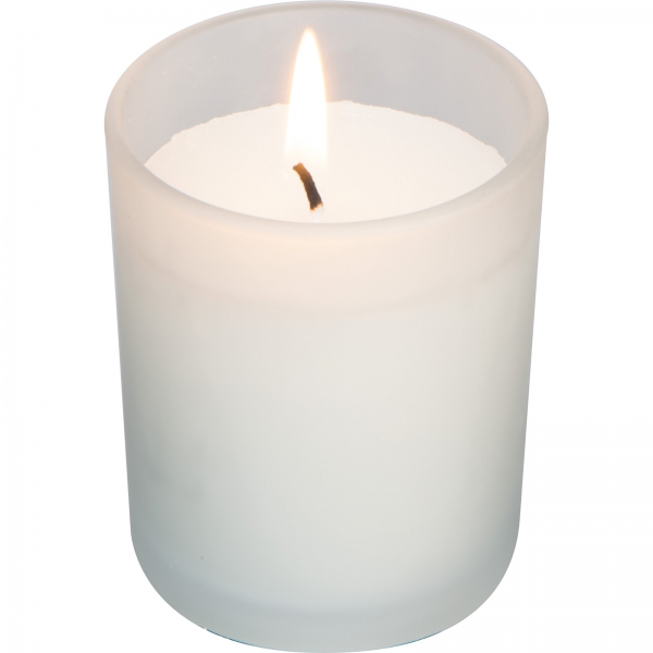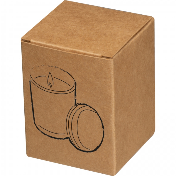 Świeczka dekoracyjna w szklanym pojemniku z bambusowym wieczkiem. Świeczka pakowana w kartonik.