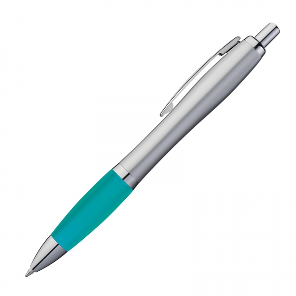 Plastikowy długopis z satynowym połyskiem, metalowym klipsem, gumowanym korpusem i dużym niebieskim wkładem.