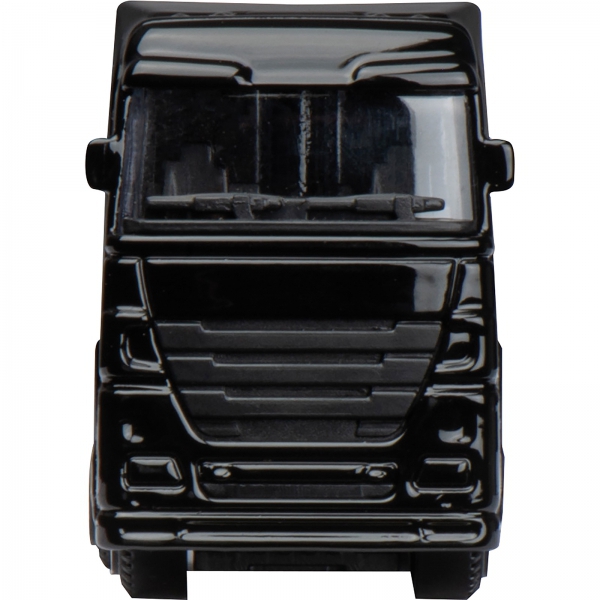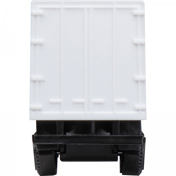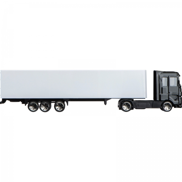 Miniaturowa ciężarówka, z metalową kabiną kierowcy i plastikową białą naczepą idealną do nadruku full colour.