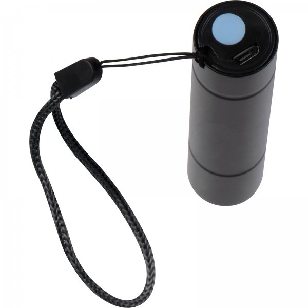 Latarka wykonana z aluminium, o pojemości 400 mAh, posiada 3 tryby świecenia - LED z przodu, migający i ciągły snop światła, oraz diodę COB z boku.