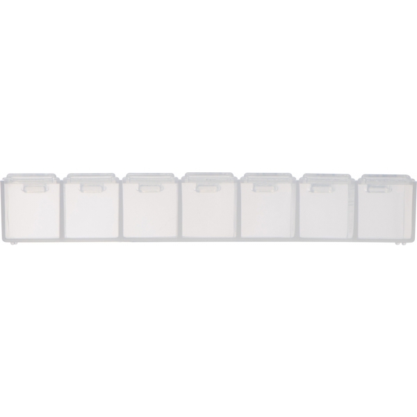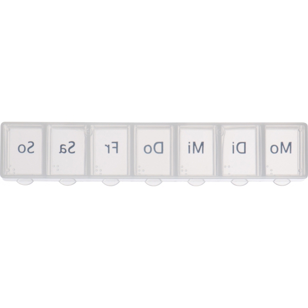 Pudełko na leki z 7 przegródkami na każdy dzień tygodnia. Dni tygodnia podane w języku niemieckim.