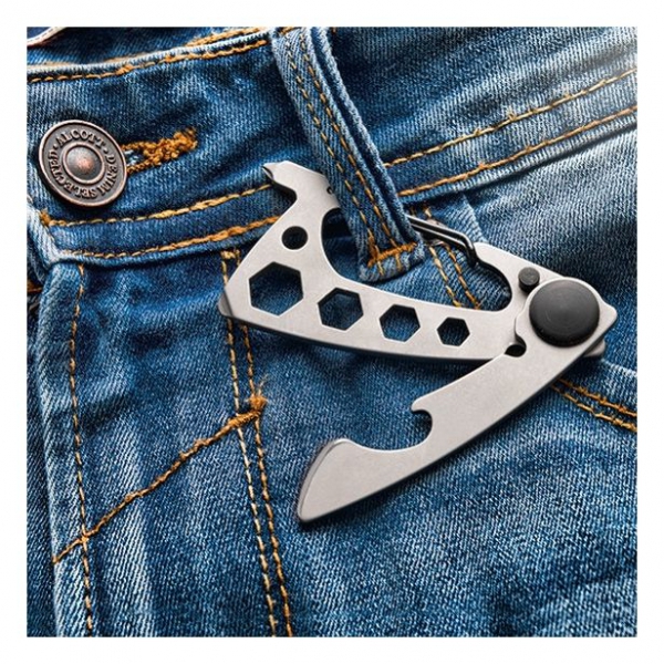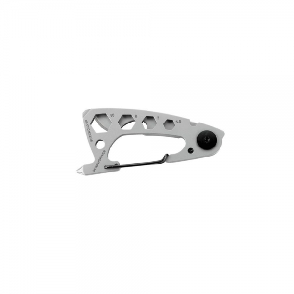 Wielofunkcyjny brelok marki Schwarzwolf zawierający 10 różnych narzędzi - otwieracz do butelek, karabińczyk, wielofunkcyjny otwieracz, przecinak do drutu, płaski śrubokręt, śrubokręt Philips oraz klucz do nakrętek w 4 rozmiarach.
