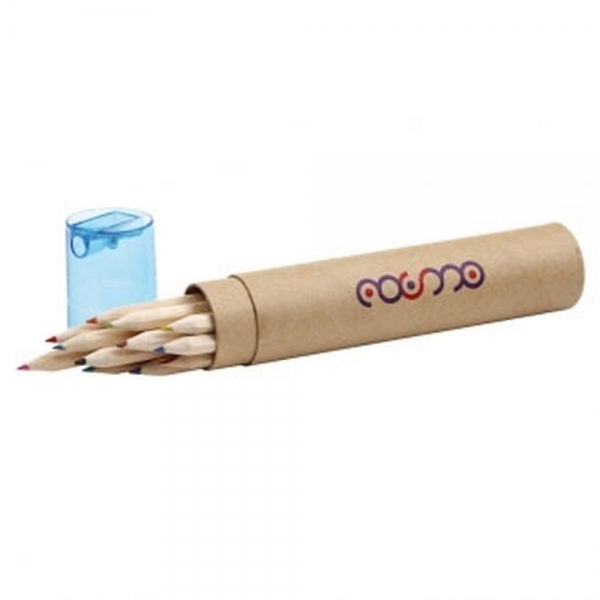 Zestaw 12 drewnianych kredek w tekturowej tubie, z temperówką umieszczoną w plastikowej zatyczce.