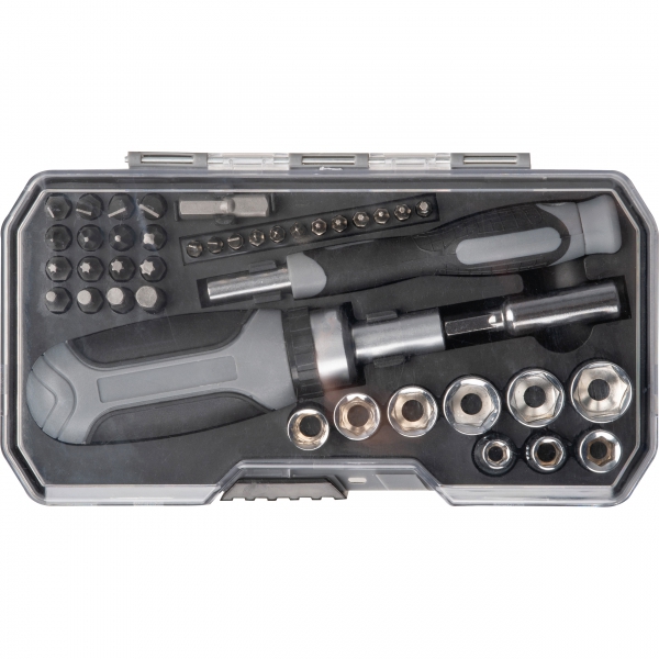 Zestaw 41 bitów i nakrętek oraz dwa uchwyty, całość w poręcznym pudełku.