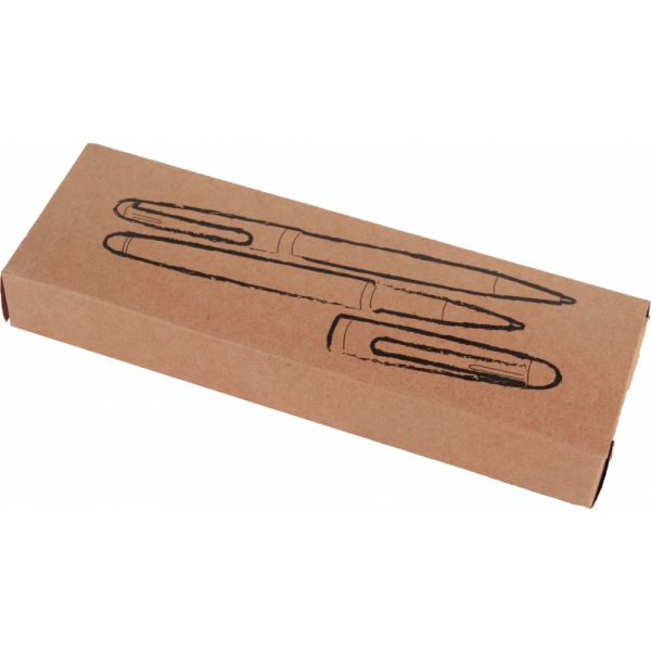 Zestaw składający się z długopisu z niebieskim wkładem oraz pióra wiecznego z dołączonym niebieskim nabojem. Funkcjonalne pudełko z drewna różanego po zamknięciu może służyć jako podstawka.