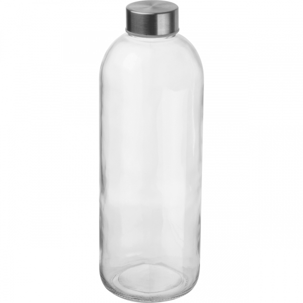 Szklana butelka o pojemności 1000 ml w neoprenowym etui, z zakrętką ze stali nierdzewnej.