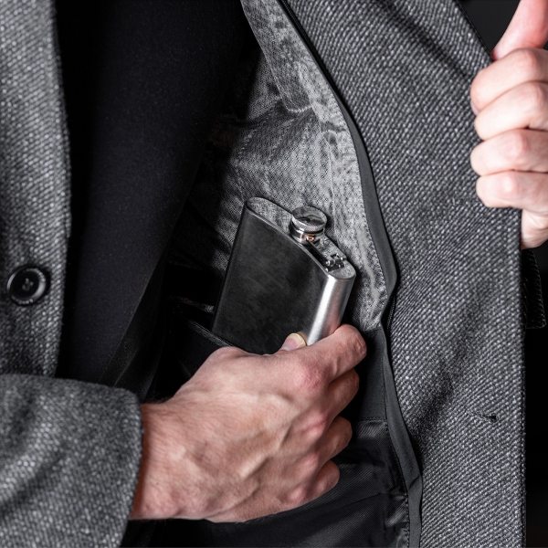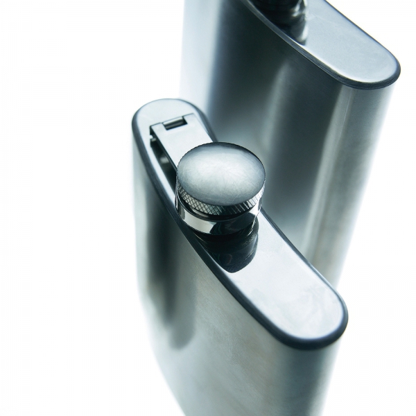 Piersiówka ze stali nierdzewnej z bezpiecznym zamknięciem, pojemność 237 ml.