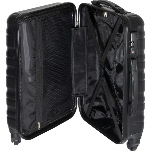 Solidna walizka na kókach z dwoma komorami - jedną oddziela materiałowe zamknięcie z dodatkową siateczkową kieszenią zamykaną na zamek, ubrania w drugiej komorze można zabezpieczyć zapięciem na elastyczne pasy. Walizka ma 4 kółeczka i teleskopową rączkę oraz dodatkowe dwa uchwyty do przenoszenia po obu stronach. Dzięki zamkowi TSA możesz być spokojny o zawartość walizki.Możliwość zamówienia zawieszki z grawerem 9086803.