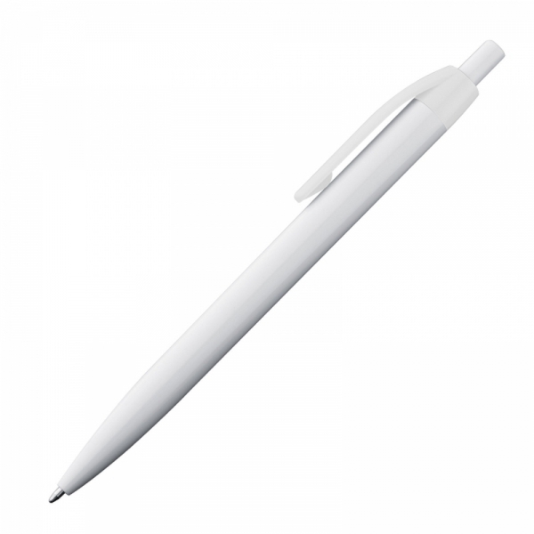 Plastikowy długopis z białym korpusem o klasycznym kształcie, wyposażony we wkład piszący na niebiesko.