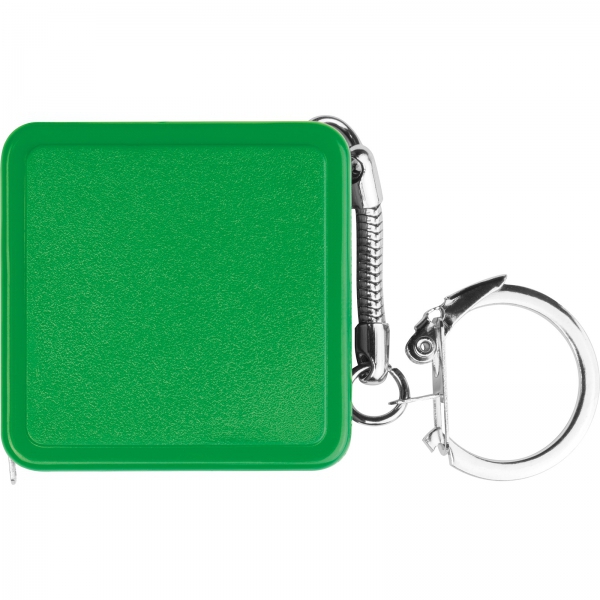 Stalowa miarka o długości 100 cm w kwadratowej obudowie z kolorowego plastiku, zawieszona na praktycznym breloku.