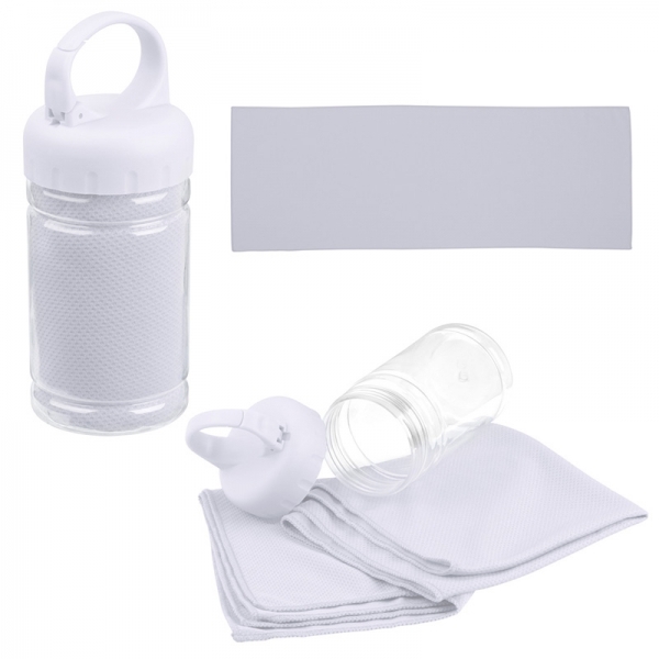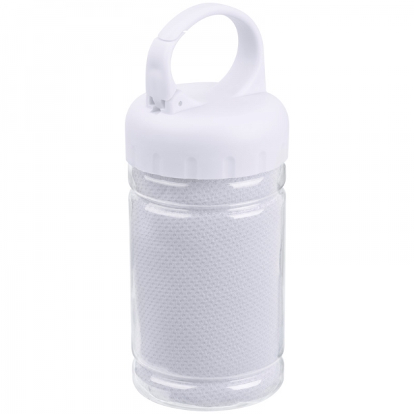 Ręcznik sportowy z szybkoschnącego materiału, umieszczony w plastikowej butelce. Zakrętka butelki ma otwierany uchwyt umożliwiający przypięcie butelki np. do paska od spodni. Ręczniki dostępne w kilku kolorach.Ręcznik 76 x 29 cmButelka 300 ml