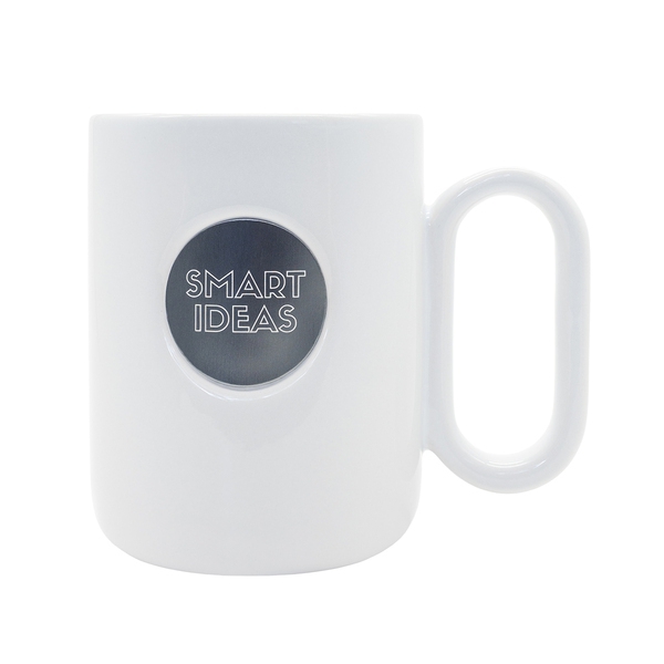 Stylowy kubek ceramiczny o błyszczącej powierzchni, która nadaje mu nowoczesny, elegancki wygląd. Z przodu znajduje się metalowy okrągły element w kolorze grafitowym (gun metal), idealny pod grawer. Ergonomiczny uchwyt zapewnia wygodę użytkowania. Pojemność 480 ml.