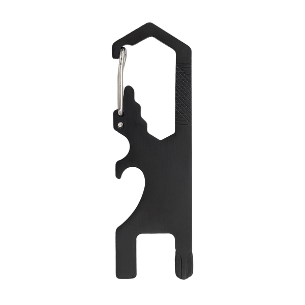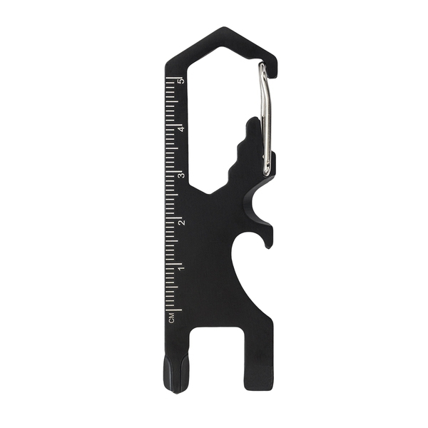 Metalowe narzędzie zawiera: śrubokręt płaski, linijka, klucz, obcinak, otwieracz do butelek, śrubokręt krzyżakowy, pilnik.