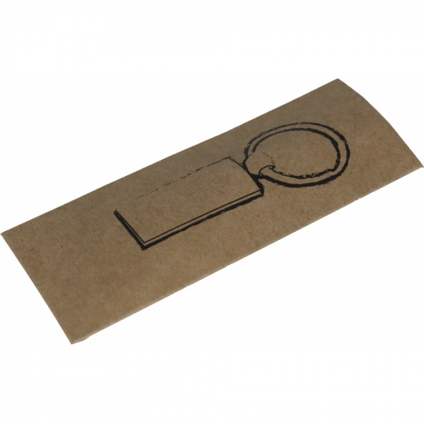 Metalowy brelok do kluczy z prostokątną matową zawieszką, na której można umieścić logotyp.