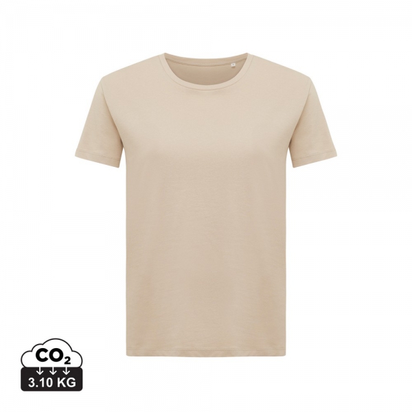 Koszulka damska, regularny krój, okrągły dekolt, krótkie rękawy, wykonana w 30% z bawełny z recyklingu i w 70% z bawełny organicznej o gramaturze 160 g/m2, posiada wbudowany znacznik AWARE™, który potwierdza wykorzystanie materiałów z recyklingu, posiada kod QR na metce, który prowadzi do cyfrowego paszportu produktu, 2% wpływów z każdego sprzedanego produktu z kolekcji Impact jest przekazywane na rzecz Water.org, ślad węglowy produktu: 3,23 kg CO2