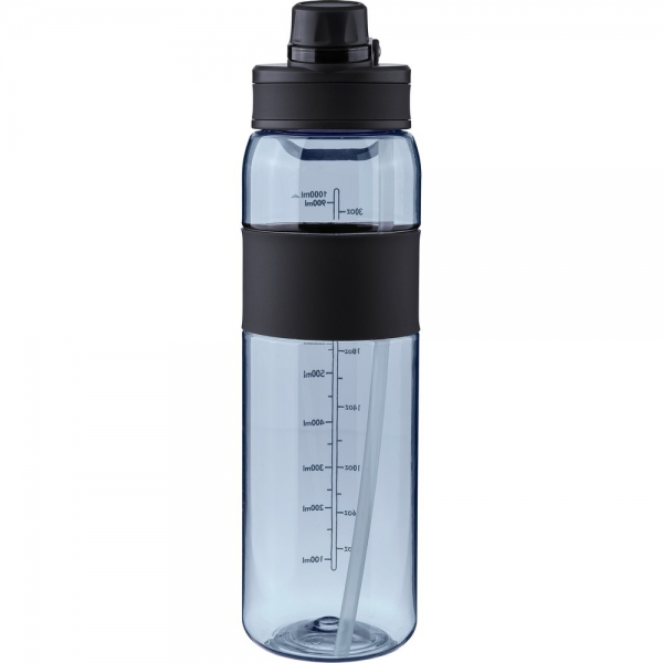 Butelka sportowa 900 ml z tritanu, ustnik i odkręcane wieczko, silikonowy pierścień, uchwyt ułatwiający noszenie, miarka z boku, zapakowana w kartonową wytłoczkę