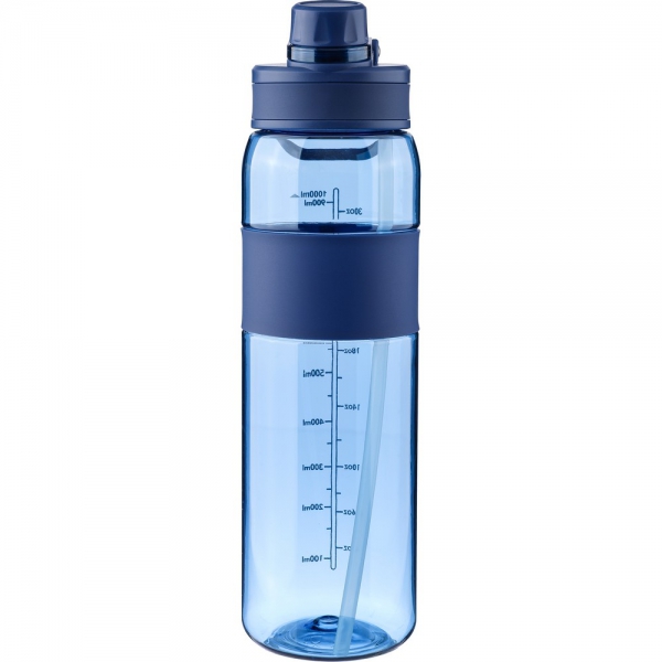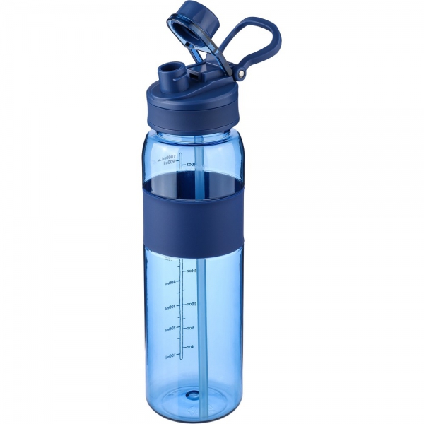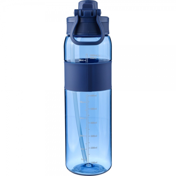 Butelka sportowa 900 ml z tritanu, ustnik i odkręcane wieczko, silikonowy pierścień, uchwyt ułatwiający noszenie, miarka z boku, zapakowana w kartonową wytłoczkę