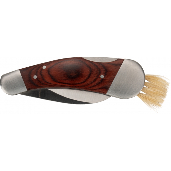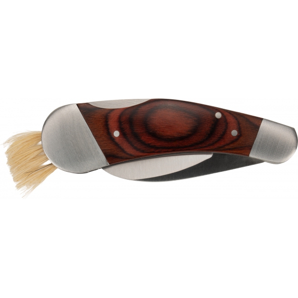 Nóż do zbierania grzybów, wykonany ze stali nierdzewnej i drewna, wyposażony w pędzelek do czyszczenia grzybów.