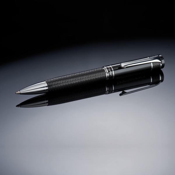 Luksusowy długopis z kolekcji Ferraghini, wyposażony w niebieski wkład. Wykończony delikatnym, przeplatanym materiałem, błyszczącym, czarnym lakierem oraz chromowanymi elementami. W zestawie z dopasowanym, skórzanym etui z magnetycznym zamknięciem, którego wnętrze zostało wyściełane delikatnym zamszem.